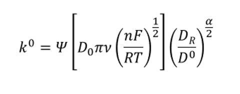 異質速率常數可藉由Nicholson方法決定,方程式如下所示,電子轉移的標準速率常數是由氧化還原波峰與頻率所決定(1-4),由文獻發表得知,禪譜科技生產的電極其異質速率常數約為2.5 X 10-4 ,速率常數越大,轉移速率越快,因此具有高電子轉移速率。(4)