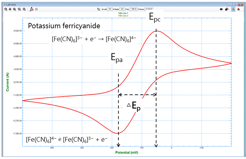 氧化還原電位差可用來計算電子轉移數目,一個電子的轉移造成的電位差(△Ep )理論上是59 mV,一般網版印刷碳電極測試出來的電位差約為116 mV,是一個良好的可逆系統。但是電位差容易受到接著劑成分與其比例、烘烤製作溫度及保存條件等因素影響,因此精準地控制上述條件是必須的。當電位差約接近時59 mV,如下頁圖譜所示,其可逆性越好,因此可依此來判定電極好壞。(1,2)