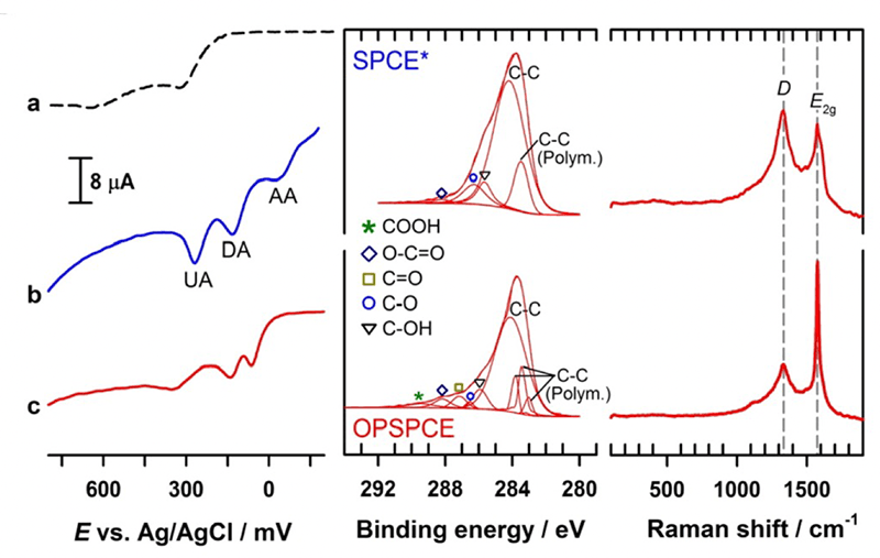 根據文獻中提到高規則結構的石墨烯表面有兩種主要結構,分別是邊緣結構(edge plane)與平面結構(basal plane),兩者的電化學特性大相逕庭,平面結構很穩定,邊緣結構則具有高活性的催化能力。文獻發表證實其特殊催化特性,並由拉曼光譜證明經由電化學預氧化的網版印刷碳電極具有相同的邊緣結構並且可以藉由電化學處理控制其數量,使其產生邊緣結構而可以在中性環境中同步偵測DA、UA及AA,如下圖所示,這是一般電極無法做到的。(1-3)