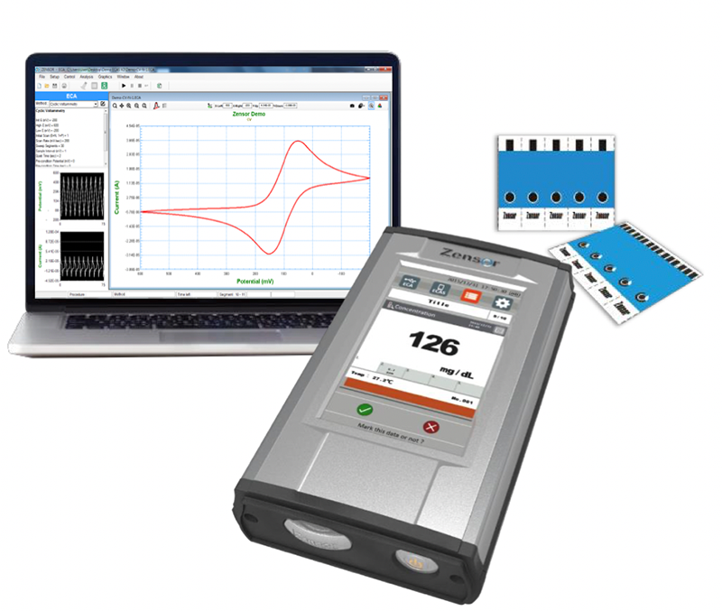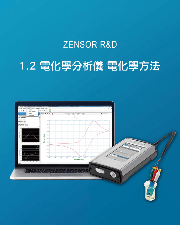 電化學分析儀常見的名稱為恆電位儀,是常 見於實驗室的中小型電化學分析儀器,隨著 方便攜帶與隨時偵測的需求與日俱增,各家 廠商紛紛開發可攜式的恆電位儀,禪譜科技 以化學感測器開發為核心,開發專屬應用於 化學感測器的萬用電化學分析儀,其中包含 常用的六種電化學分析方法外,最特別的是 具有測表(meter)的功能,讓研究人員不僅 可以在實驗室開發自有技術,也可以讓專屬 技術快速轉換最小可行性產品(Minimum Viable Product, MVP),可在任何地方進行 離線操作偵測,不須額外連接電腦進行數據 分析,只要經過四個步驟簡單操作便可同步 完成電化學偵測、數據分析、濃度轉換以及 結果即時顯示。