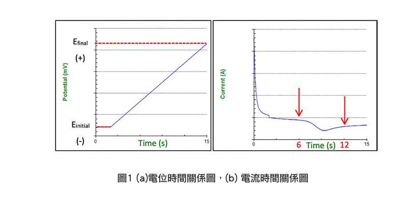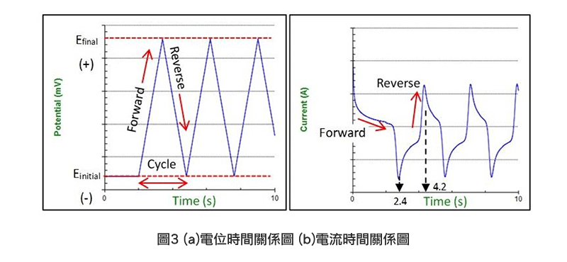 循環伏安法(CV)的電位掃描設定可由正電位開始或者是由負電位開始掃描,如圖3所 示,第一圈由負電位往正電位掃描時為正向掃描(forward),掃到終點電位後折返往 回掃描則為反向掃描(reverse),並構成一三角波形循環,反之亦然。圖3(b)是電流對 時間關係圖,當施予正想掃描電位到了時間2.2秒左右時開始有大量氧化電流產生, 於2.4秒達到最大,相反的,接續進行反向掃描時,於約4秒時開始還原反應,到了 4.2秒時達到還原電流最大而形成一循環,所以研究人員可根據這些資訊針對未知的 分析進行定性與定量的研究。