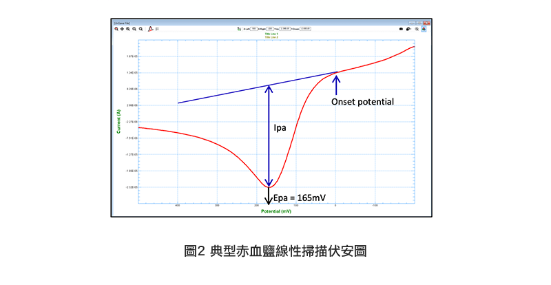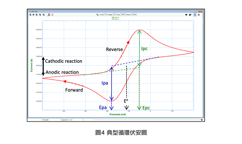 圖4是典型的赤血鹽循環伏安圖,可觀察到電極對赤血鹽的氧化還原反應 ,由圖譜得 知以下資訊,當進行氧化掃描時(由負電位往正電位掃描),可得到氧化波峰電位(Epa) 與氧化波峰電流(Ipa),代表其氧化最大反應值,相反的進行反向掃描時,可到還原 波峰電位(Epc)與還原波峰電流值(Ipc)。氧化反應(Anodic reaction)代表分析物失去 電子給電極,還原反應(cathodic reaction)則是分析物從電極得到電子而被還原。理 論上,氧化波峰電位與還原波峰電位的中間值即為形式電位(Eo)。