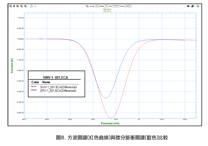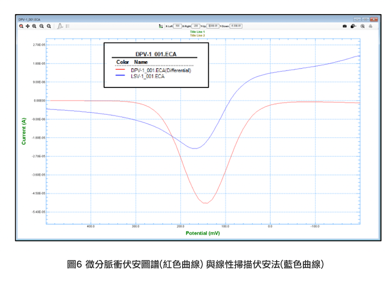 Sir Geoffrey Barker 是脈衝伏安法(PV)的發明者,此項技術改善了充電電流效應及薄 層擴散效應而大大降低了偵測靈敏度,微分脈衝伏安法(DPV),顧名思義其方法是藉 由電流取點之間的差異做數據計算,第一點一般會取在脈衝之前,第二點會取在脈 衝後40ms的電流,相減後則為顯示的單點電流值。 圖5(a,b)是微分脈衝的波形圖譜,波形呈現階梯狀並且伴隨著一固定振幅而逐漸改變 電位, 同時記錄產生之電流值。如圖5(c)所示,在t1與t2產生之電流值會經過計算相 減後得最終單點電流而得到如圖6的典型圖譜,微分脈衝伏安法(紅色曲線)得到的訊 號會比線性掃描伏安法(藍色曲線)的訊號值大,由圖6可得知,因此可降低分析偵測 極限,大大提升分析靈敏度。