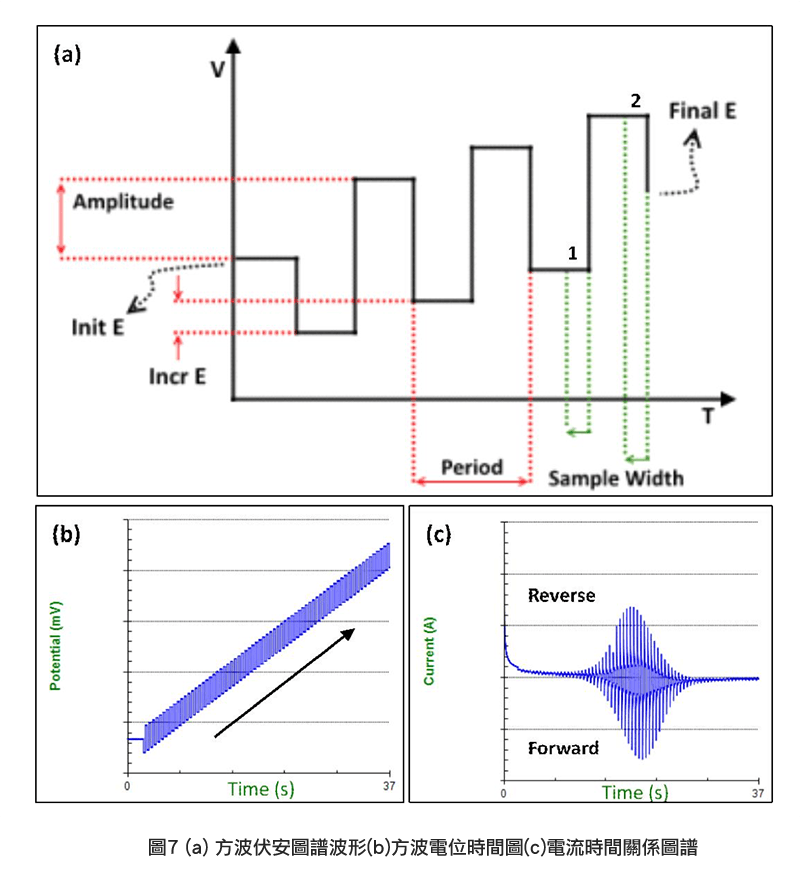 • 方波伏安法(SWV)的基本操作原理是對工作電極給予一大振幅微分脈衝之方形波電位, 如圖7(a,b)所示,經方波循環週期收集兩次反應電流,分別是順向脈衝(Forward pulse)的末點電流1與逆向脈衝(Reverse pulse)之末點電流2,兩點相減可得淨電流 (Net current, 如圖8),具有放大訊號之效果,與微分脈衝伏安法比較有較佳的靈敏 度,此方法適合分析可逆性極佳之分析物。此外,方波伏安法主要優點還包含快速 掃描,有效掃描速率為方波頻率(Square wave frequency, Hz)與電位變化(Step height, V)相乘,因此可減少掃描時間以快速完成分析。