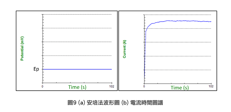 安培法(IT)的基本原理是施予一固定電位於工作電極,以時間為函數對應所得電流值 之變化,如圖9所示;於電化學分析系統中,安培法所施加的電位因分析物種不同而 有所改變,通常為其氧化或還原電位。當分析物因電位之故而進行反應造成電子轉 移則會表現於電流量的變化,藉此應用於定量分析。