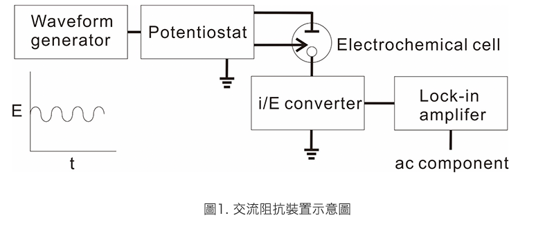 交流阻抗(AC impedance)也稱做電化學阻抗圖譜(Electrochemical impedance spectroscopy,EIS),起源於法拉第阻抗量測,也就是電化學系統中電極表面電阻或 電容。此方法是在施予一微小正弦電位波條件下同時改變不同頻率之反應並計算得 出阻抗值。如圖1所示,一微小正弦電位波訊號產生自波形產生器(waveform generator )經由電位儀施加於系統中,然後反應產生之電流或電位經由轉換器(i/E converter)與放大器(lock-in amplifier)轉換放大訊號為角頻率(angular frequency,ω)、相位角度(phase angle,ψ)及角向量(phasor)等資訊,最終計算為阻 抗值。