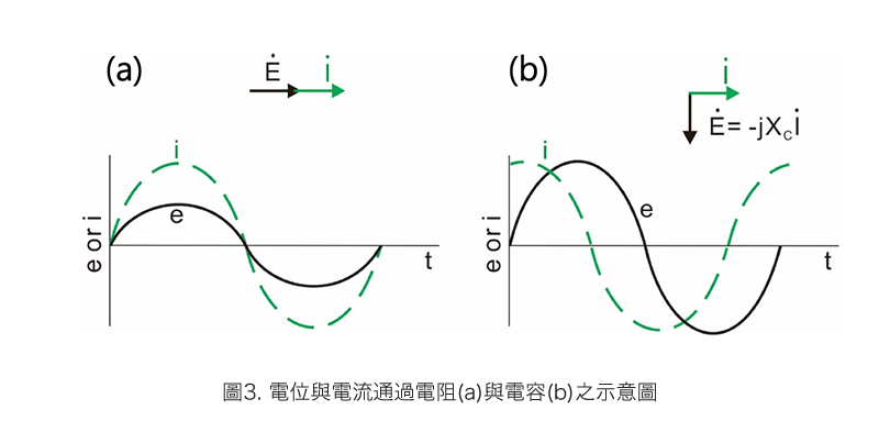 一個經過相位角為零的電阻器之簡單電路,其正弦電位表示為 e = E sin ωt,反應之 電流遵守歐姆定律,即為方程式 (E/R) sin ωt ,如圖3(a)。然而當電位或電流通過電 容時,其關係表示為 i = (E/Xc) sin (ωt + π/2),其中Xc 是電容阻抗,也就是1/ωC。 產生之電流波形會領先電位波形,如圖3(b)所示。一般而言,阻抗會分為兩個部分, 實部(real parts ZRe )與虛部(imaginary parts Zim ),虛部計算須乘上j= 終交流阻抗方程式表達成Z(ω) = ZRe – jZIm. (1) 。