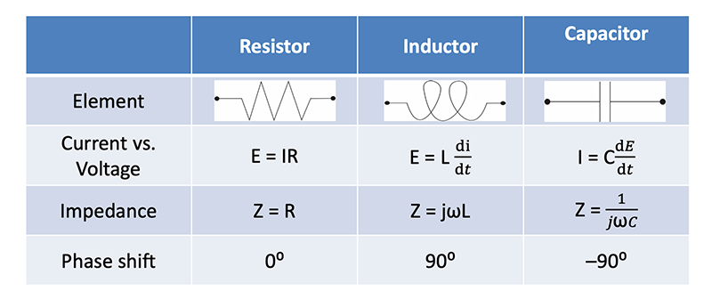 一般等效電路元件包含電阻、電容與電感,如表所示,列出三元件的圖示、電流電 位關係式、阻抗及相位等資訊。電阻阻抗為實部阻抗基本上與頻率無關,電感阻抗 會隨頻率增加而增加,其通過之電流相位為正90度且只有虛部。電容阻抗則隨頻率 增加而減少,其通過之電流相位為負90度且只有虛部。