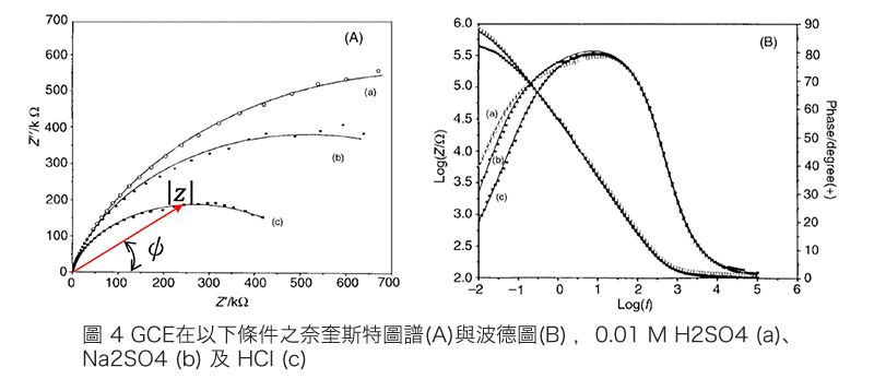 交流阻抗可表達成奈奎斯特圖與波德圖,奈奎斯特圖是實部阻抗(ZRe)與虛部阻抗 (Zim )在不同角頻率下(ω)作圖,如圖4(A)所示。波德圖則是log 𝑧 和相位角phase angle ψ 分別和log ω 作圖,如圖4(B)所示。奈奎斯特圖中,右邊為低頻區,左邊為 高頻區,在低頻區的電容線其傾斜角會介於0° and 45°,其阻抗表示為ZCPE = 1/T(jω)γ,其中T當γ = 1時代表為純電容,γ則與有α關係(α = (1 – γ)90°),所以當α = 0 及 γ = 1 時視為完美電容,而γ值受電極表面粗糙度影響。 (1)