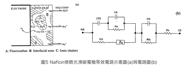 以一真實系統為例來說明等效電路,文獻中說明Nafion修飾光滑碳電極之等效電路 示意圖如圖5(a)所示,其通過等效電路的電阻與電容之電流有相同之振幅與相位角。 一般常用之模型為Randles equivalent circuit,如圖5(b)所示。GCE/Nafion的介面 可視為恆相位元件(constant phase element,CPE),其中並聯還包含電荷轉移阻抗 (charge-transfer resistance,Rct)與純等容(pure capacitor,Cdl),而體阻抗(bulk resistance,Rb)與體電容(bulk capacitance,Cb)並聯表示為Nafion介面電雙層特性, 為了維持電中性,陽離子會進出薄膜,此外電路還容納包含Rfs 與 Cfs 並聯。最後電 路與溶液電阻Rs串聯。