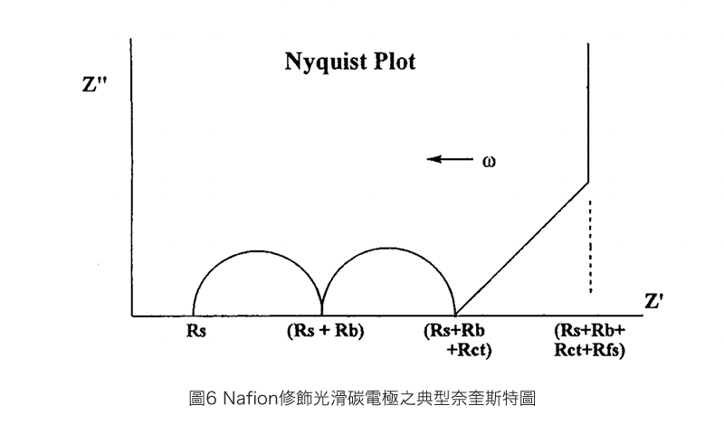 如同文獻說明,Nafion修飾光滑碳電極之奈奎斯特圖如圖6所示,第一個半圓形曲線 出現在高頻區代表為Nafion的介電特性,第二個半圓是代表Rct 及 CPE,兩半圓之後 的直線則是氧化還原物質傳遞的限制造成,典型特徵為與Z’軸成45度角。在低頻區 的垂直線代表薄膜的電容所致,除了ZD,電路中的元件皆假設與頻率無關。